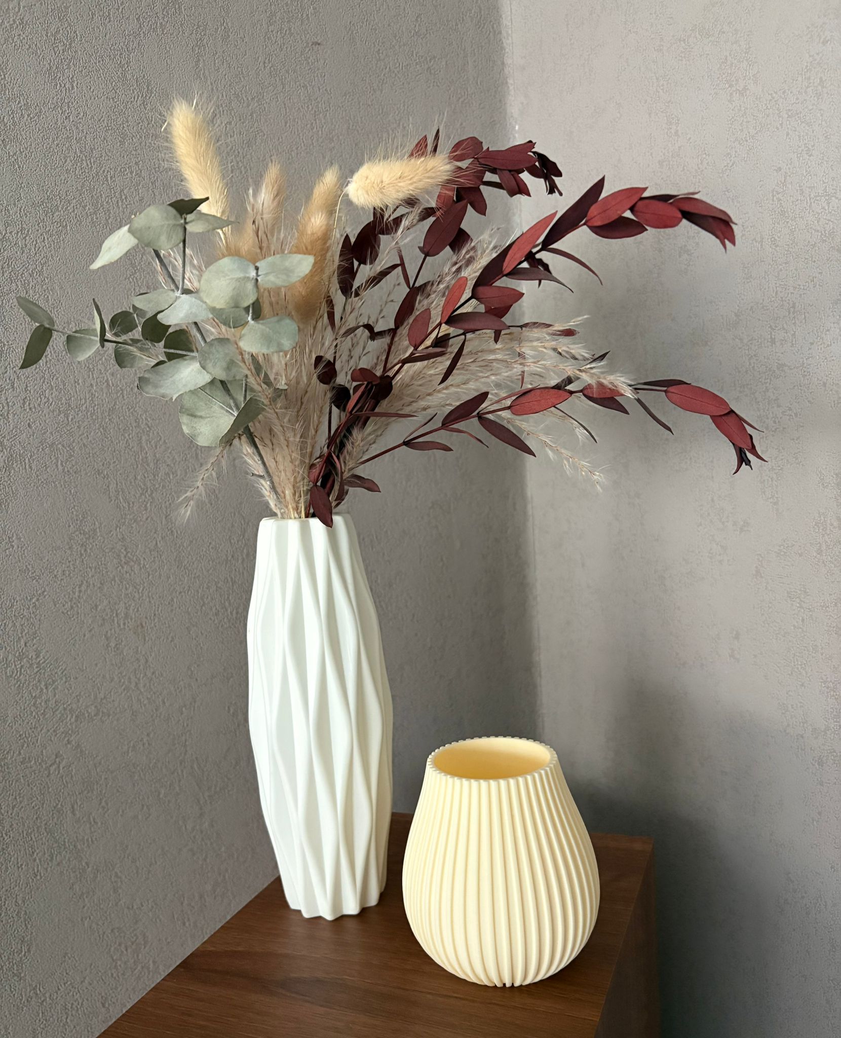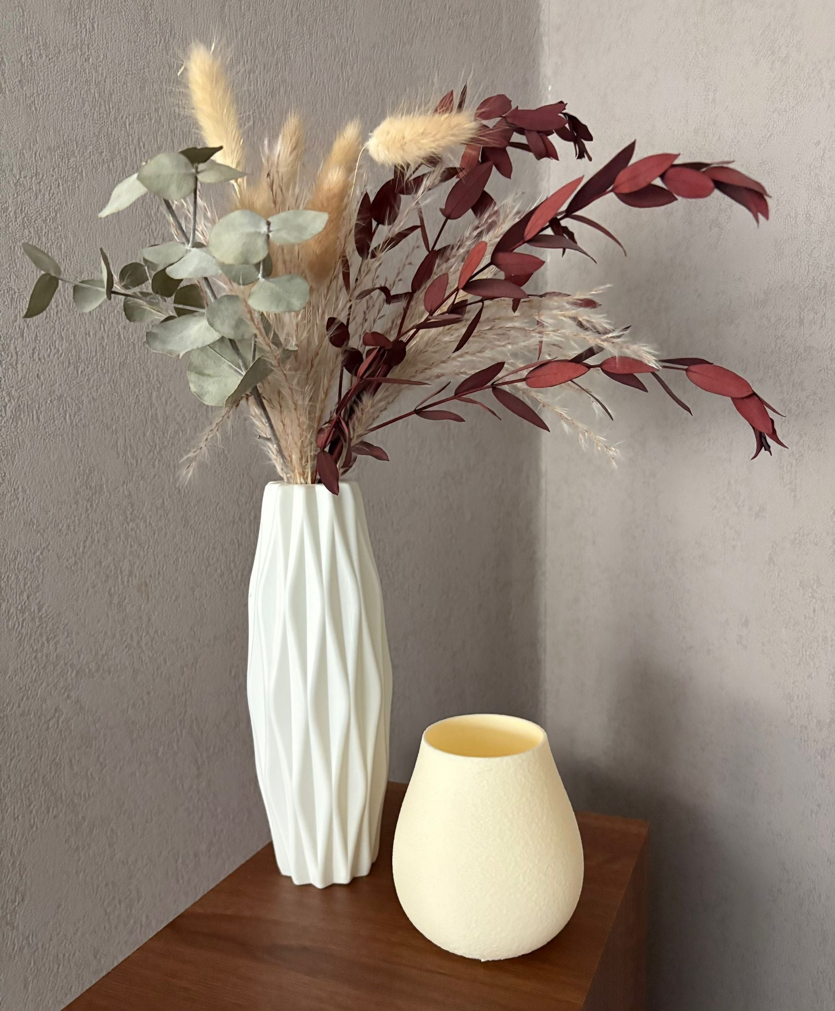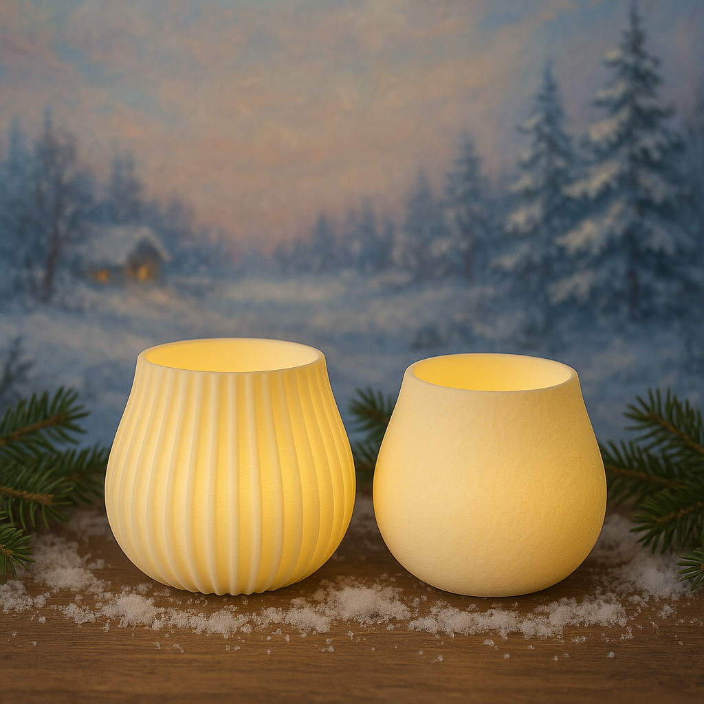 Dieses besondere Windlicht vereint modernes 3D-Druck-Design mit zeitloser Eleganz. Gefertigt aus cremweißem PLA-Filament, bietet es zwei Oberflächenvarianten: